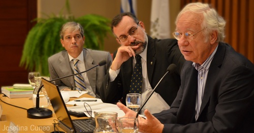 El Dr. José Joaquín Brunner presentó Educación Superior en Iberoamérica, Informe 2011, elaborado por el Centro Interuniversitario de Desarrollo (CINDA), con el apoyo de Universia y el Banco Mundial, el 10 de abril en la Sede Central. La conferencia fue un espacio de diálogo y debate sobre los principales retos de las políticas de educación superior en el continente y, muy particularmente, nuestro país. Comentaron la presentación la Dra. Panambí Abadie, encargada de Programas y Proyectos de la Asociación de Universidades del Grupo Montevideo y el Dr. Pablo Landoni, especialista en políticas de educación y director del Sistema de Bibliotecas de nuestra Universidad. La presentación estuvo a cargo del P. Dr. Eduardo Casarotti SJ, rector de la universidad y del Mag. Carlos Romero, de la Vicerrectoría Académica. Asistieron a la actividad, personalidades del campo de la educación superior uruguaya, como el Dr. Jorge Grünberg, rector de la Universidad ORT, el Ing. Agr. Alvaro Díaz Maynard, presidente del Consejo Consultivo de la Enseñanza Terciaria Privada, el Ing. Agr. Fernando García Préchac, decano de la Facultad de Agronomía de la Udelar y el Dr. Alejandro Abal Oliú, decano de la Facultad de Derecho del Instituto Claeh. En la foto: el Dr. Pablo Landoni, el rector P. Dr. Eduardo Casarotti SJ y el Dr. José Joaquín Brunner.