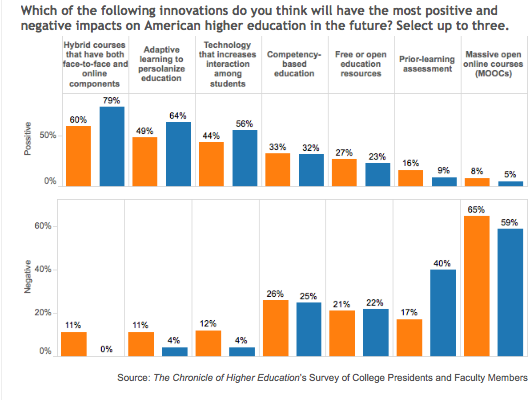 Among the innovations being discussed now, presidents and faculty members were most negative about MOOCs. Some 60 percent of presidents and 65 percent of professors think that MOOCs will have a negative impact on the future of higher education. Presidents and faculty members were most positive about the potential of hybrid courses. On the topic of competency-based learning, 51 percent of professors and 46 percent of presidents agreed that colleges should award credit based on what students know instead of time spent in a seat.