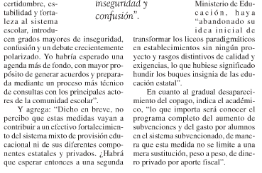 Explicó que en el fin al lucro, “dos años para adaptarse al nuevo sistema es poco; deberíamos pensar en 3 ó 4”, y se mostró conforme “en que el privado pueda recuperar su inversión, pero no estoy seguro de que la compra de infraestructura por parte del Estado sea la mejor fórmula”.