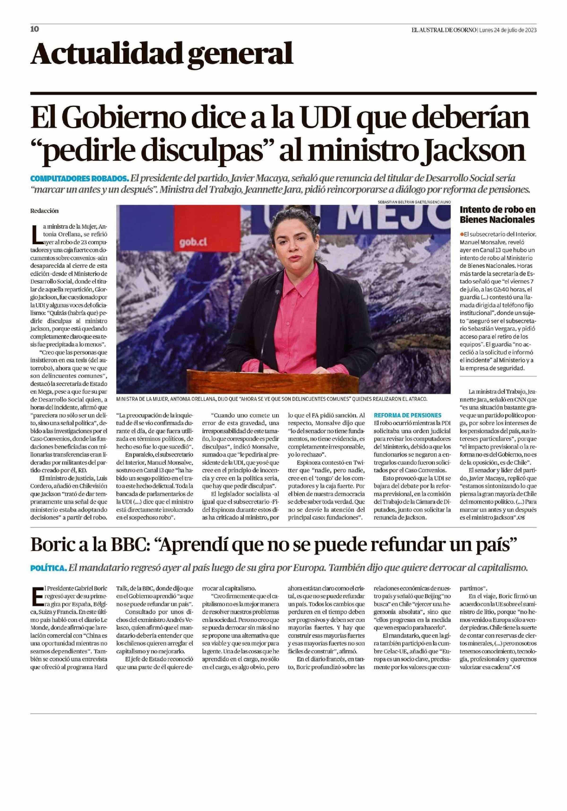 - Boric a la BBC: «Aprendí que no se puede refundar un país» (El Austral de Osorno, 24 de julio de 2023).